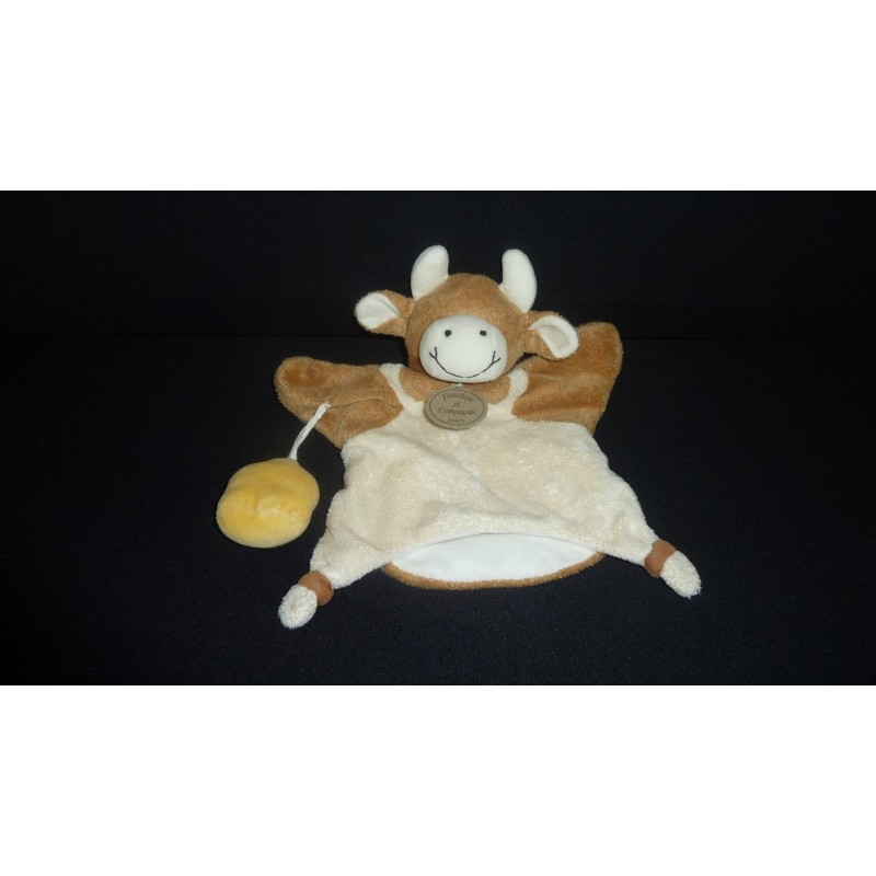 Description du doudou : Doudou marionnette vache, tient un grelot. Doudou super doux. Etat : Très bon état (juste petites taches sur un coin), produit original.