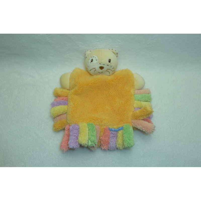 Description du doudou : Doudou marionnette chat de 21 cm environ de longueur. Coloris : orange, franges multicolores. Etat : Comme neuf. Produit original. DOUDOU DIFFICILE A TROUVER