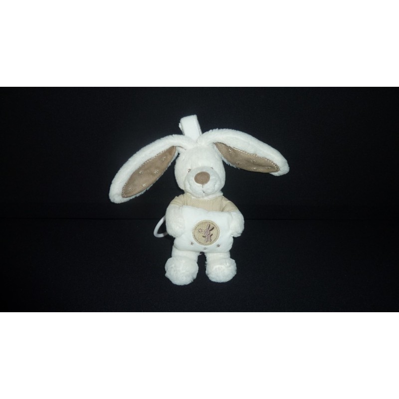 Description du doudou : Doudou musical lapin de 21 cm environ (sans les oreilles). Doudou super doux. Etat : Neuf (encore l'attache étiquette boutique mais plus l'étiquette boutique), produit original.