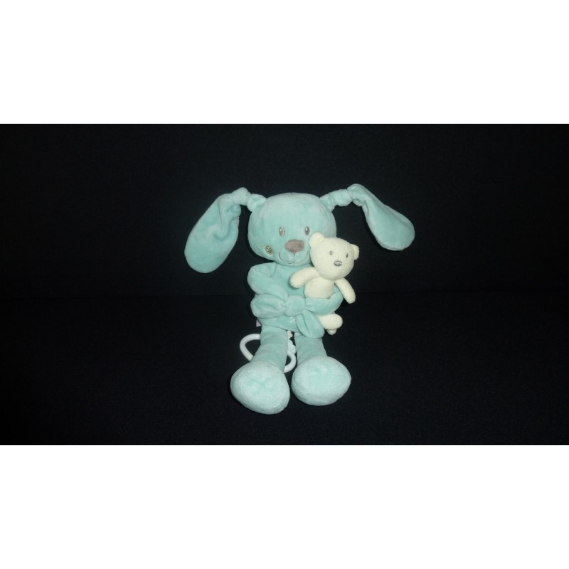 Description du doudou : Doudou musical lapin de 28 cm environ (sans les oreilles), tient un petit ours, musical. Doudou super doux. Etat : Neuf, sans étiquette boutique. Produit original.