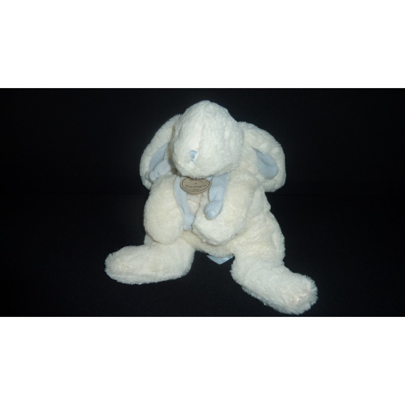 description du doudou : Doudou peluche lapin de 34 cm environ (sans les oreilles), billes au popotin et dans les pattes. Coloris : crème, écharpe et intérieur des oreilles : bleu. Doudou super doux. Etat : Neuf sans étiquette boutique, produit original.