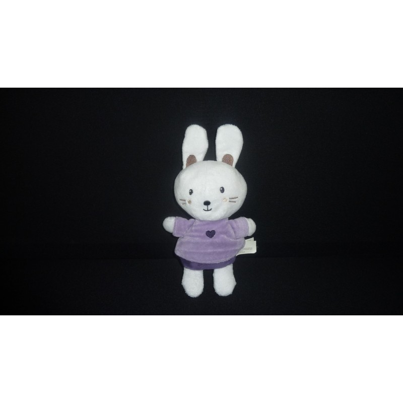 description du doudou : Doudou peluche lapin de 24 cm environ (oreilles comprises), t shirt mauve avec petit coeur brodé. Doudou super doux. Etat : Neuf sans étiquette boutique, produit original.