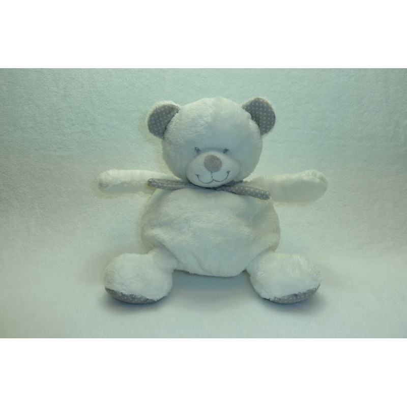 Description du doudou : Doudou peluche ours de 28 cm environ. Coloris : blanc motif petits pois. Doudou super doux. Etat : Neuf sans étiquette boutique. Produit original. DOUDOU DIFFICILE A TROUVER