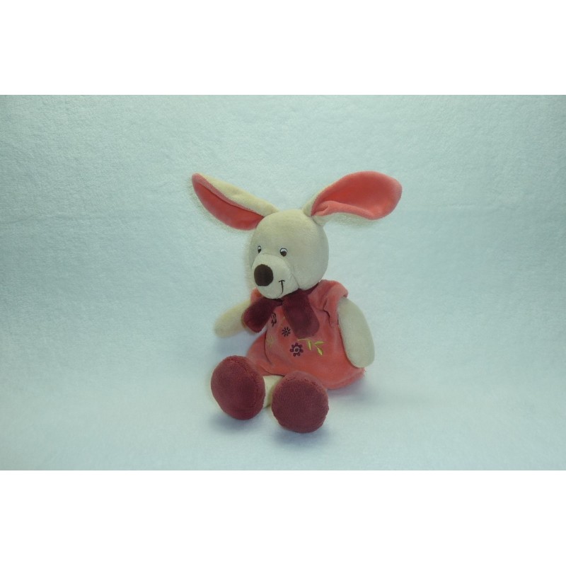 Description du doudou : Doudou peluche lapin de 28 cm environ sans les oreilles, porte une robe et une écharpe. Doudou super doux. Etat : Comme neuf (étiquette de la marque coupée), produit original.