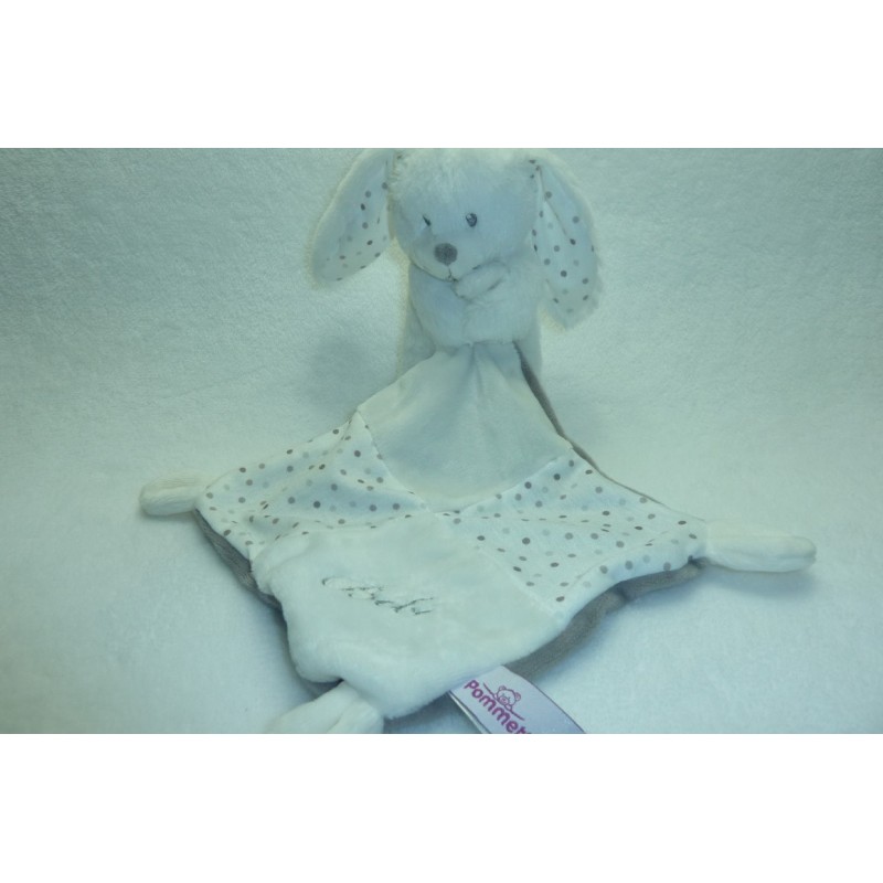 Description du doudou : Doudou peluche lapin de Pommette, 17 cm environ de hauteur (sans compter les oreilles), mouchoir. Coloris : blanc, petits pois, gris, Bébé brodé. Doudou super doux. Etat : Neuf sans étiquette boutique (un mini accroc sur une oreille dû à l'attache étiquette boutique). Produit original. DOUDOU DIFFICILE A TROUVER