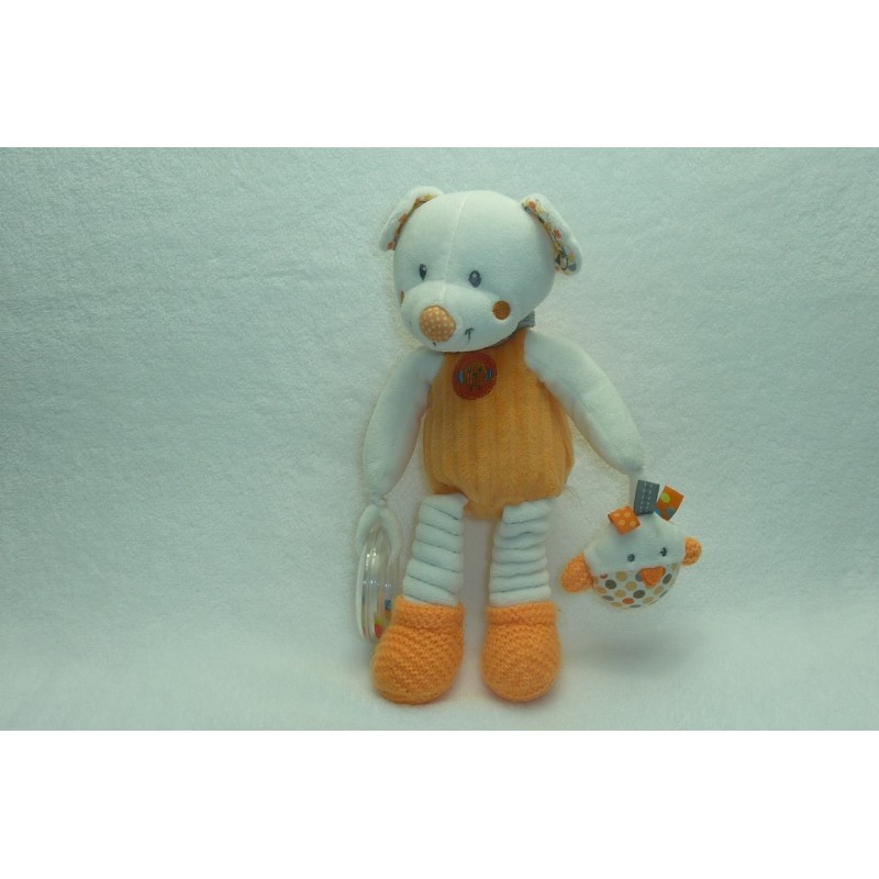 Description du doudou : Doudou peluche ours de 28 cm environ : anneau à grelot, tient un petit oiseau. Coloris : orange, blanc. Etat : Comme neuf (étiquette de la marque coupée). Produit original. DOUDOU DIFFICILE A TROUVER