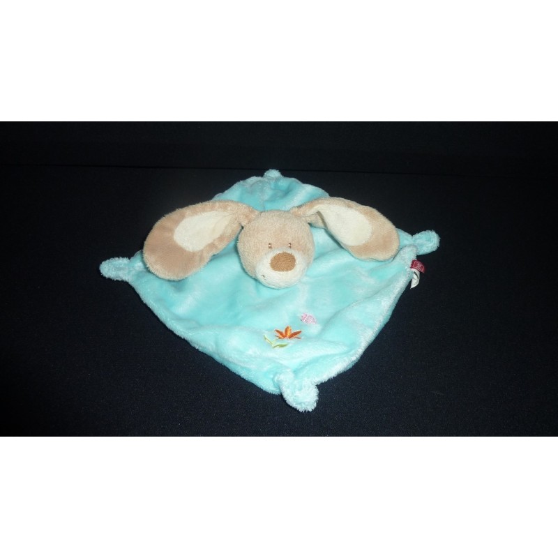 Description du doudou : Doudou plat lapin, fleur et papillon brodés. Coloris : bleu turquoise. Doudou super doux. Etat : Très bon état, produit original.