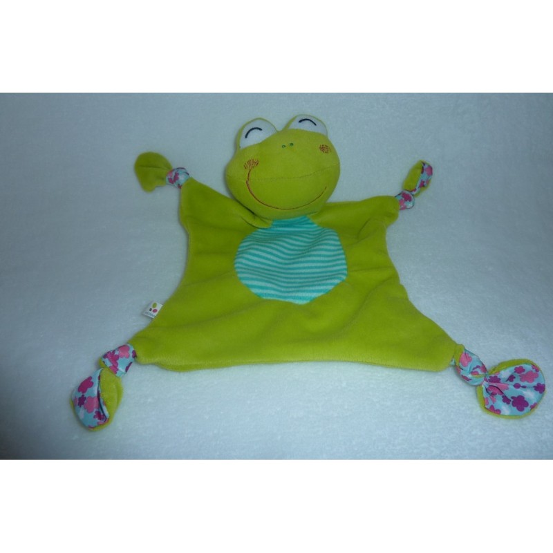 Description du doudou : Doudou plat grenouille, grelot, 4 nouages. Doudou super doux. Etat : Neuf sans étiquette boutique. Produit original.