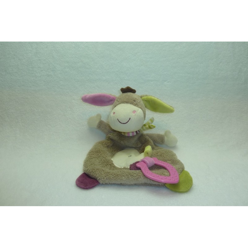 Description du doudou : Doudou plat âne, anneau de dentition. Coloris : marron, blanc, vert, porte une écharpe. Doudou super doux. Etat : Comme neuf. Produit original. DOUDOU DIFFICILE A TROUVER