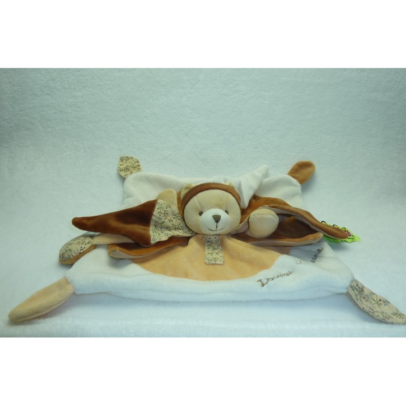 Description du doudou : Doudou plat ours. Coloris : blanc, marron motif fleurs. Doudou super doux. Etat : Comme neuf. DOUDOU DIFFICILE A TROUVER