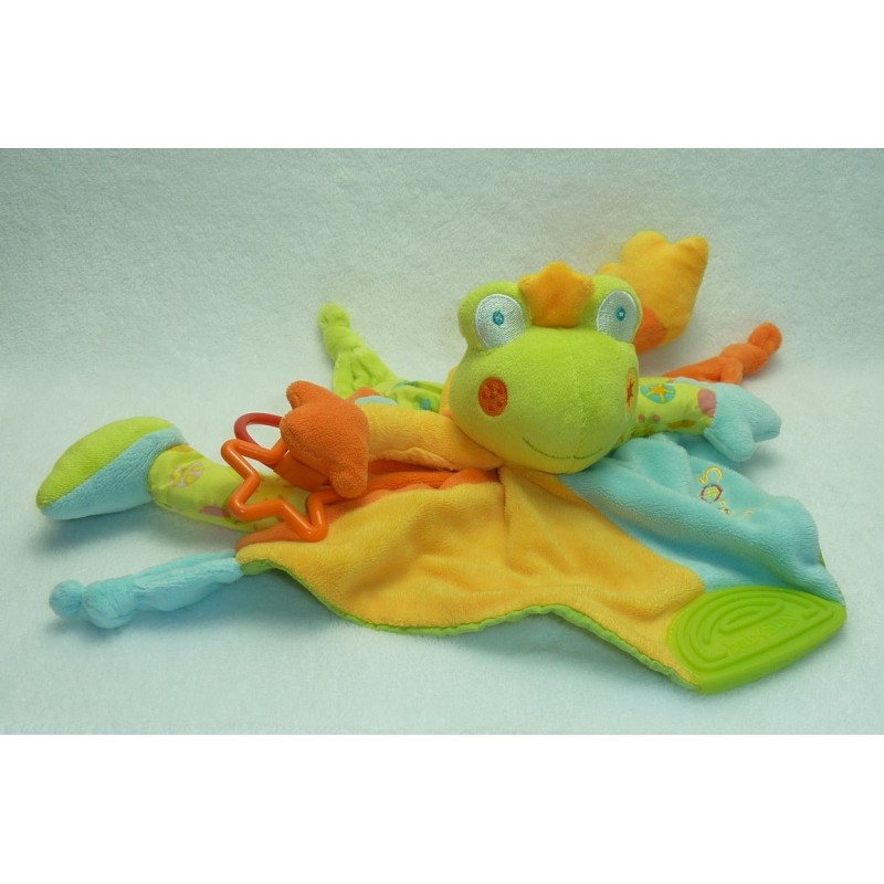 Description du doudou : Doudou plat grenouille de 25x24 cm environ, 3 nouages, grelot, anneau de dentition, pouet pouet. Coloris : vert, jaune, orange, tissu imprimé. Doudou super doux. Etat : Comme neuf. Produit original. DOUDOU DIFFICILE A TROUVER