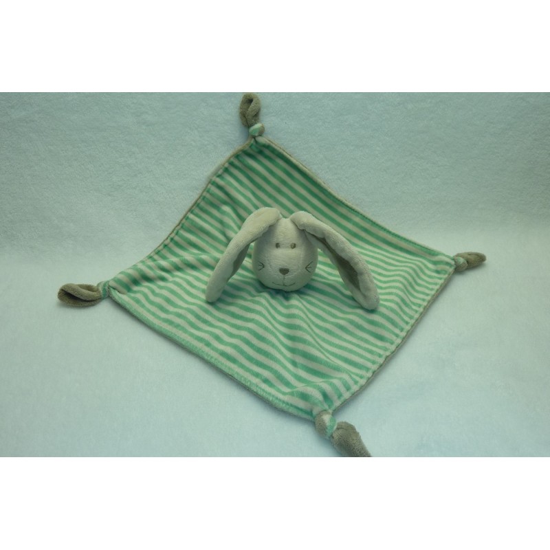 Description du doudou : Doudou plat lapin, 22x25 cm environ, 4 nouages . Coloris : rayures vert blanc, verso marron taupe . Doudou super doux. Etat : Très bon état (étiquette de la marque coupée), produit original. DOUDOU DIFFICILE A TROUVER
