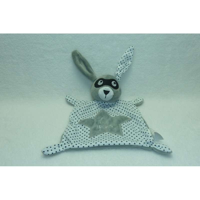 Description du doudou : Doudou plat lapin de 29 cm environ de longueur oreilles comprises. Coloris : gris, tissu blanc étoilé. Etat : Neuf sans étiquette boutique . Produit original. DOUDOU DIFFICILE A TROUVER