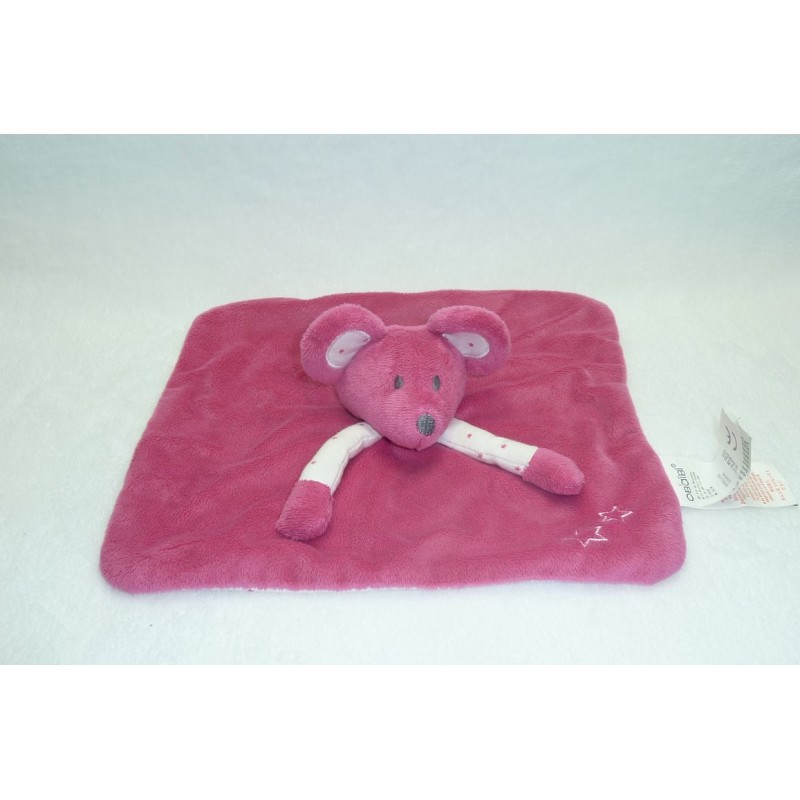 Description du doudou : Doudou plat souris de 25x24 cm environ. Coloris : fuschia, tissu blanc imprimé étoiles. Doudou super doux. Etat : Comme neuf. Produit original. DOUDOU DIFFICILE A TROUVER