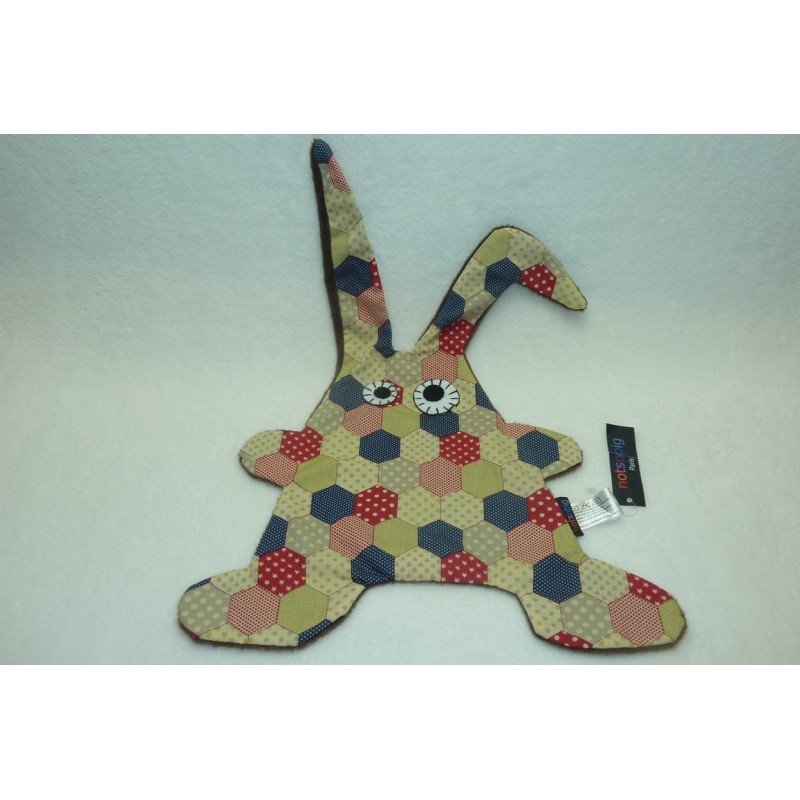 Description du doudou : Doudou plat lapin de 40 cm environ de longueur avec les oreilles. Coloris : tissu imprimé, marron. Etat : Neuf. Produit original. DOUDOU DIFFICILE A TROUVER