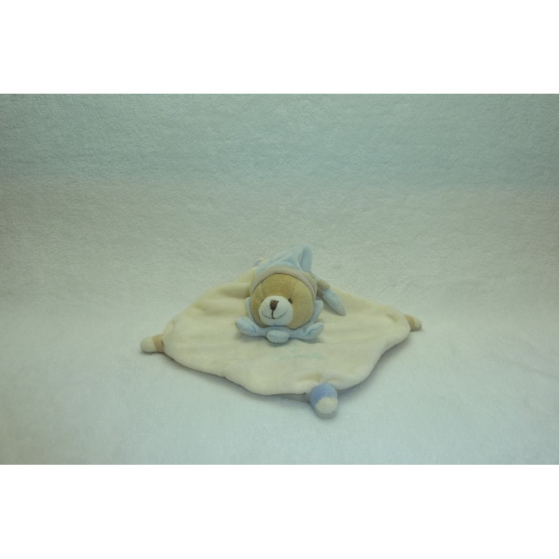 Description du doudou : Doudou plat ours de 16x15 cm environ. Coloris : écru, taupe au verso, bonnet et collerette bleu ciel. ATTENTION DE BIEN VERIFIER DOUDOU CAR PLUSIEURS MODELES ET COULEURS POUR CET ARTICLE. Etat : Comme neuf (étiquette de la marque coupée). Produit original. DOUDOU DIFFICILE A TROUVER