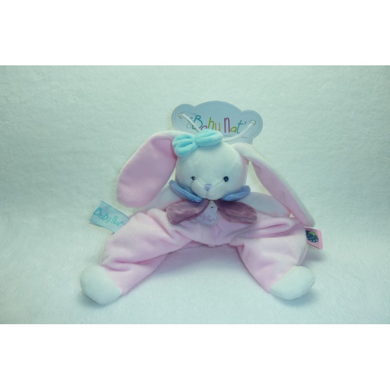 Description du doudou : Doudou plat lapin de 25 cm environ de longueur (sans les oreilles). Coloris principal : rose. Etat : Neuf. DOUDOU DIFFICILE A TROUVER