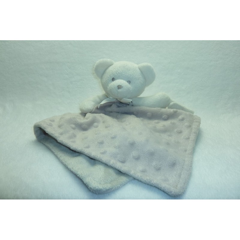 Description du doudou : Doudou plat ours de 33 cm environ de longueur, attache tétine par velcro. Coloris : blanc gris taupe, matière gauffré flocons. Etat : Très bon état général, l'attache tétine n'adhère plus. Produit original. DOUDOU DIFFICILE A TROUVER