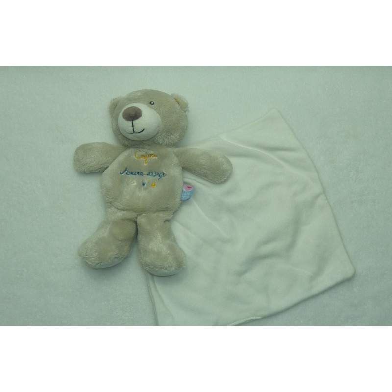 Description du doudou : Doudou semi plat ours de 17 cm environ, mouchoir. Coloris : gris, mouchoir blanc. Etat : Comme neuf . Produit original. DOUDOU DIFFICILE A TROUVER
