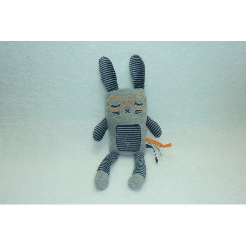 Description du doudou : Doudou semi plat lapin de 30 cm environ. Coloris : gris, rayures bleu gris. Etat : Comme neuf (étiquette de la marque coupée). Produit original. DOUDOU DIFFICILE A TROUVER