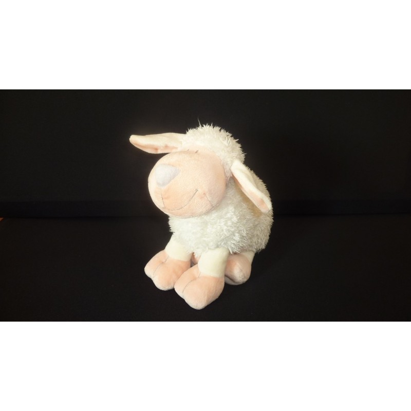 Description du doudou : Doudou mouton peluche de 20 cm environ de hauteur et 28 cm environ de longueur, billes dans les pattes. Doudou super doux. Etat : Très bon état (étiquette de la marque coupée, et minous incrutés dans la laine, rien de méchant), produit original.
