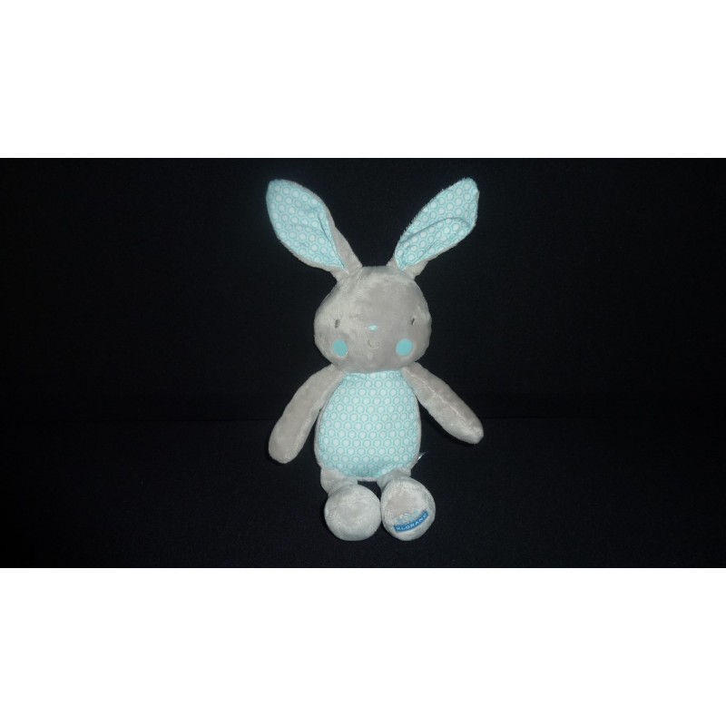 Description du doudou : Doudou peluche lapin de 25 cm environ (sans les oreilles). Coloris : gris, turquoise motif alvéoles. Doudou super doux. Etat : Neuf sans étiquette boutique (défaut d'origine sur une oreille), produit original.