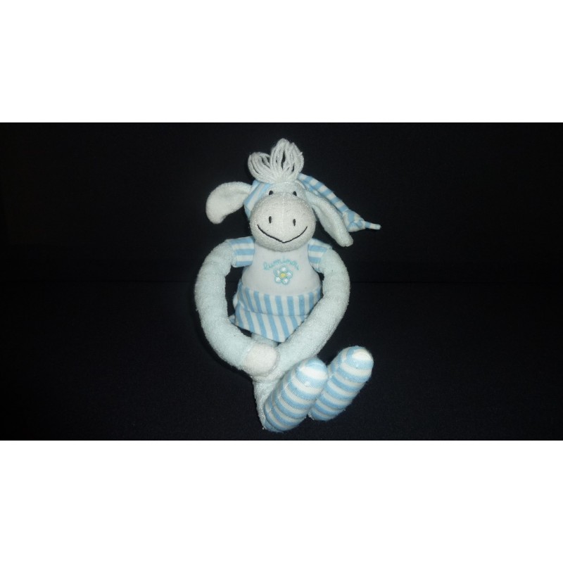 Description du doudou : doudou peluche cheval de 36 cm environ (sans le bonnet), robe bleu, éclair la nuit, velcro aux pattes. Doudou super doux. Etat : Très bon état (quelques bouloches, un petit accroc sous une patte), produit original.