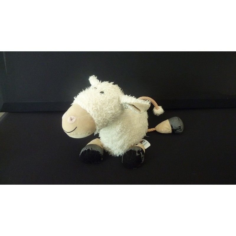 Description du doudou : doudou peluche mouton de 30 cm environ de hauteur, pattes velours, billes dans le ventre et les pattes. Doudou super doux. Etat : très bon état mais manque velours sur les pattes, produit original.