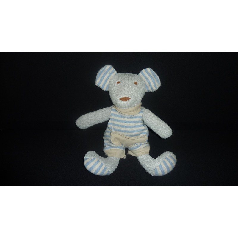 description du doudou : Doudou peluche souris de 30 cm environ, porte une combi à rayures avec petite poche. Doudou super doux. Etat : Comme neuf, produit original.