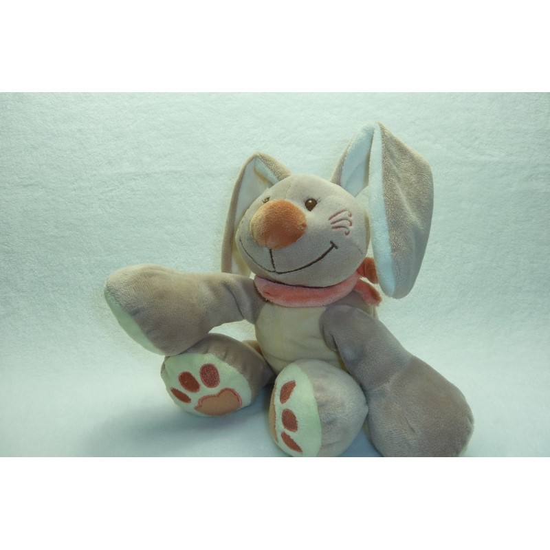Description du doudou : Doudou peluche lapin de 31 cm environ (de hauteur jambes tendues et sans les oreilles), billes dans les oreilles. Doudou super doux. Etat : Comme neuf. Produit original. DOUDOU DIFFICILE A TROUVER