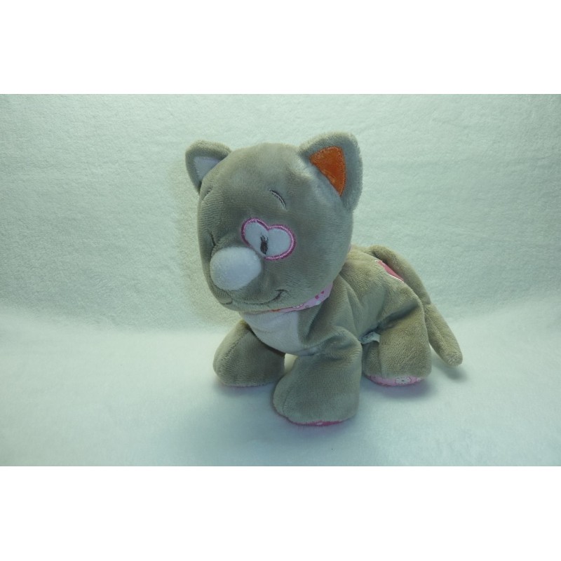 Description du doudou : Doudou peluche chat de 23 cm environ de hauteur. Coloris : gris, cœur rose, nœud. Doudou super doux. Etat : Comme neuf. DOUDOU DIFFICILE A TROUVER