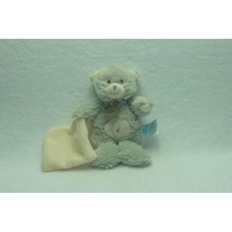Description du doudou : Doudou peluche ours de 21 cm environ. Coloris : gris, crème, mouchoir crème. Doudou super doux. Etat : Neuf sans étiquette boutique. Produit original. DOUDOU DIFFICILE A TROUVER