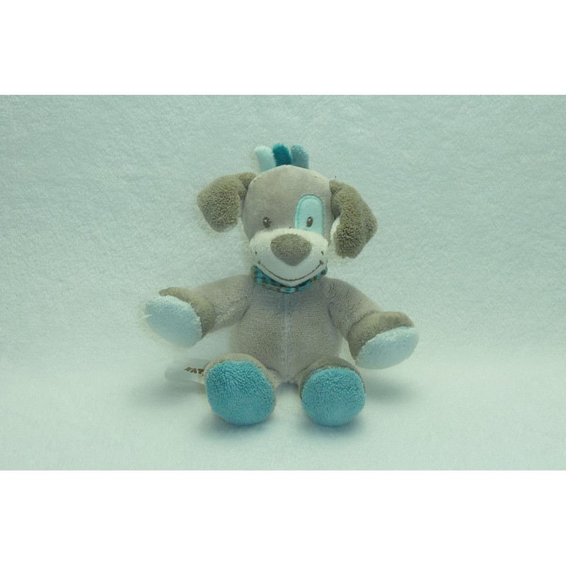 Description du doudou : Doudou peluche chien de 20 cm environ, grelot. Coloris : beige, taupe, bleu. Etat : Comme neuf. Produit original. DOUDOU DIFFICILE A TROUVER