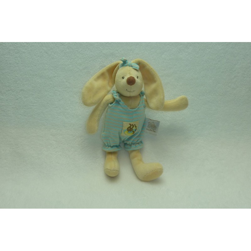 Description du doudou : Doudou peluche lapin de 21 cm environ sans les oreilles, grelot. Coloris : beige, combi rayé beige turquoise. Etat : Très bon état (petit trou sur la combi. Produit original. DOUDOU DIFFICILE A TROUVER