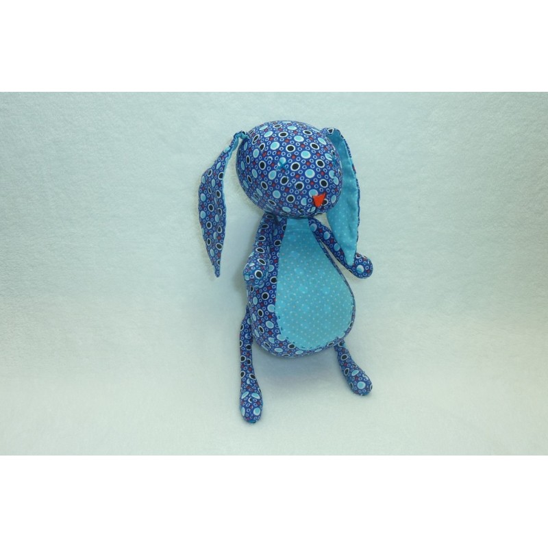Description du doudou : Doudou peluche lapin de 25 cm environ jambes tendues, bras et jambes articulées. Coloris : turquoise, violet, motifs petits pois, ronds. Etat : Comme neuf. Produit original. DOUDOU DIFFICILE A TROUVER