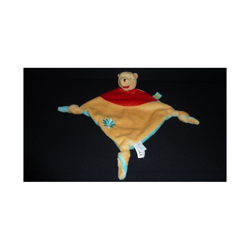 Description du doudou : Doudou plat ours Winnie Disney, 37 cm environ de hauteur (tout compris). Coloris : rouge, marron, turquoise, fleur brodée. Doudou super doux. Etat : Comme neuf. Produit original. DOUDOU DIFFICILE A TROUVER