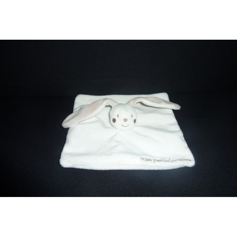 Description du doudou : Doudou plat lapin de 20x19 cm environ. Coloris : blanc,taupe, Mon premier doudou brodé. Etat : Comme neuf (étiquette de la marque coupée). Produit original. DOUDOU DIFFICILE A TROUVER