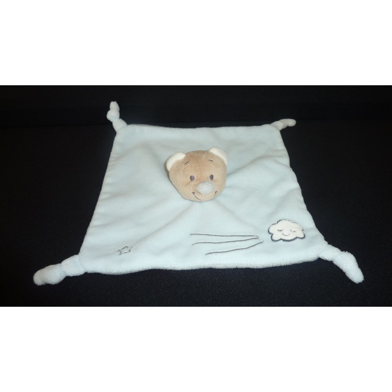 Description du doudou : Doudou plat ours, carré, 4 nouages, étoile nuage brodé. Doudou super doux. Etat : Comme neuf (étiquette de la marque coupée), produit original.