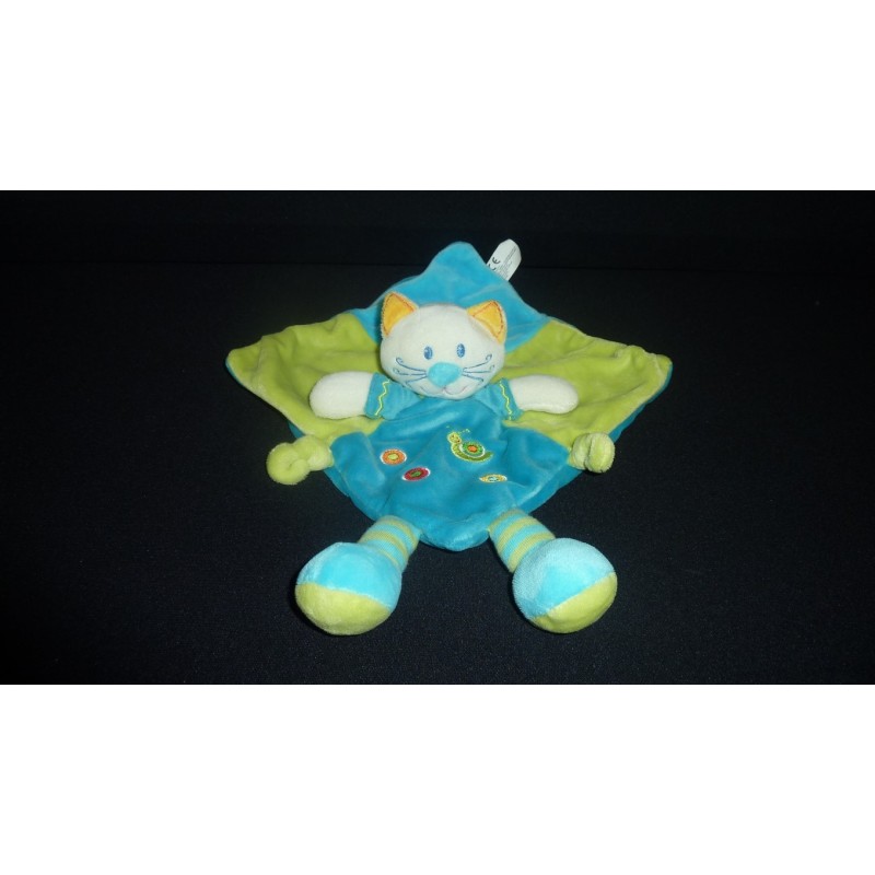 Description du doudou : Doudou plat chat, 2 petits nouages, ronds, escargot brodés. Coloris: turquoise, vert. Doudou super doux. Etat : Comme neuf, produit original.