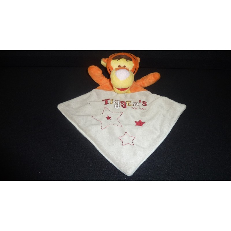 Description du doudou : Doudou plat tigre Tigrou, forme losange, Tigger's, étoiles brodés. Doudou super doux. Etat : Très bon état (mais déchirure sur le devant). Produit original.