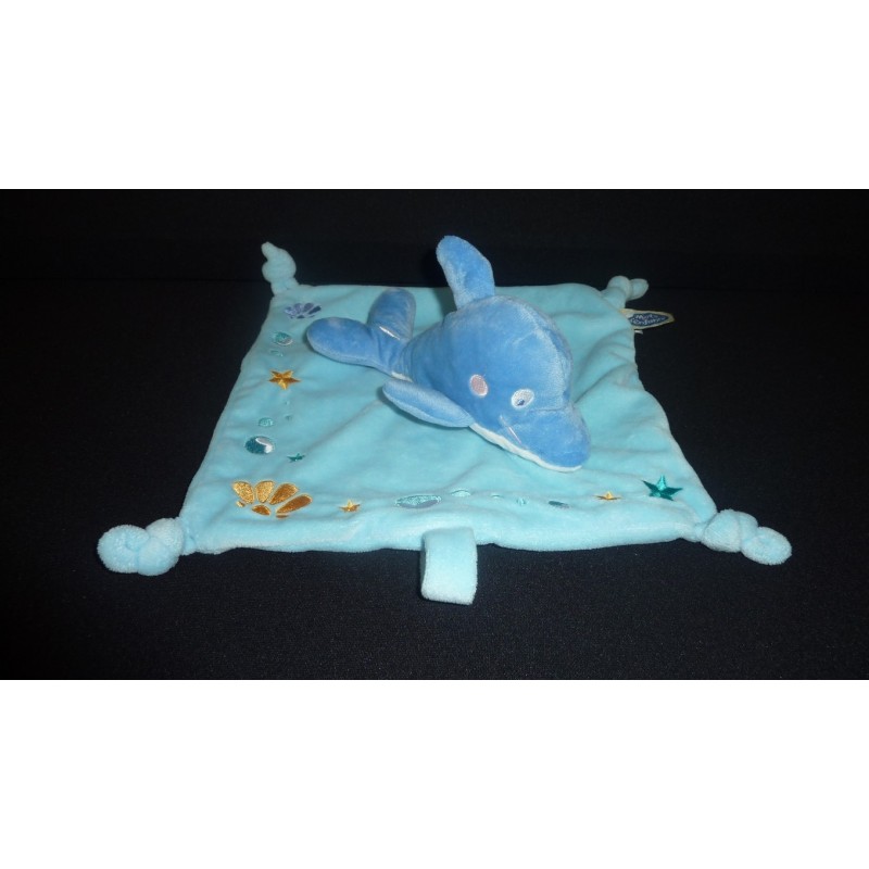 Description du doudou : Doudou plat dauphin, attache tétine par velcro, 4 nouages. Doudou super doux. Etat : Comme neuf (le velcro adhère moins mais d'origine), produit original.