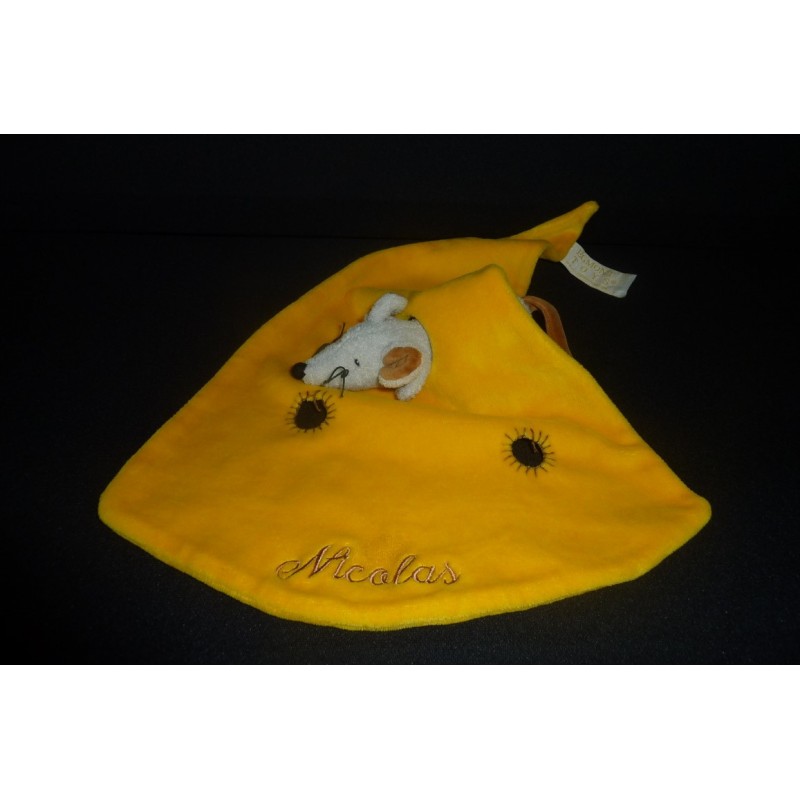 Description du doudou : doudou plat, souris 15 cm environ (sans la queue), billes dans le ventre, mouchoir forme fromage à trous, prénom de Nicolas brodé. Doudou super doux. Etat : Comme neuf, jamais utilisé, produit original.