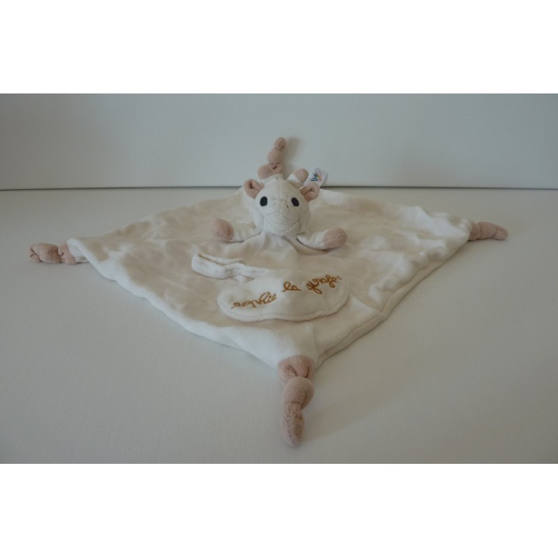 Description du doudou : Doudou plat girafe, petite poche avec attache tétine par velcro, 4 nouages. Doudou super doux. Etat : Bon état (taches au verso, rien de méchant). Produit original