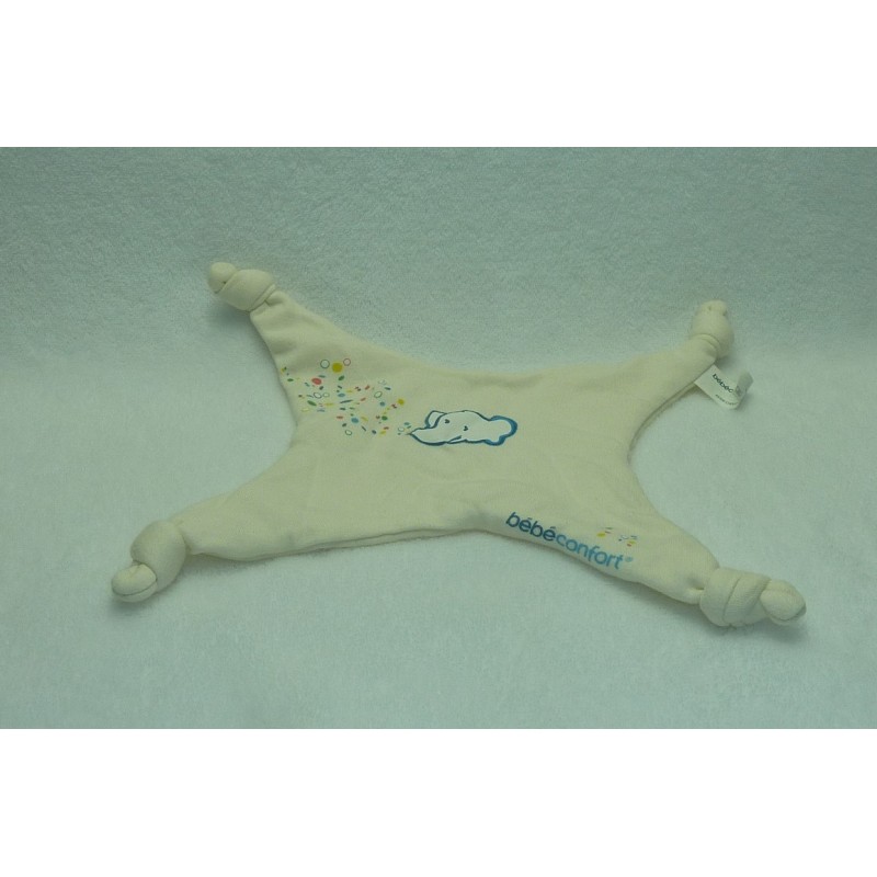 Description du doudou : Doudou plat éléphant, 25x21 cm environ y compris les nouages, 4 nouages. Coloris : écru, motif : éléphant. Doudou super doux. Etat : Comme neuf. Produit original. DOUDOU DIFFICILE A TROUVER