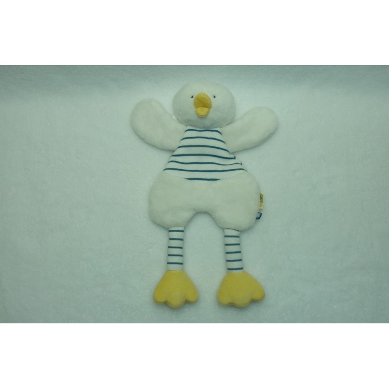 Description du doudou : Doudou plat canard de 26 cm environ de longueur, grelot, pouet pouet. Coloris : blanc, rayures bleu blanc. Doudou super doux. Etat : Comme neuf . Produit original. DOUDOU DIFFICILE A TROUVER