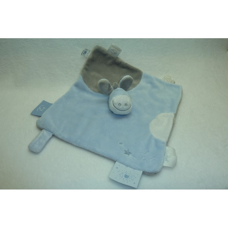 Description du doudou : Doudou plat âne de 27x25 cm environ, bordé d'étiquettes, attache tétine par velcro. Coloris : bleu, gris étoiles brodées. Etat : Très bon état (quelques étiquettes où le dessin est effacé). Produit original. DOUDOU DIFFICILE A TROUVER
