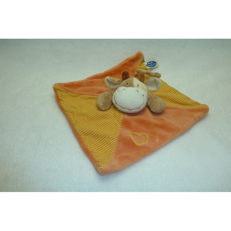 Description du doudou : Doudou plat vache de 22x24 cm environ. Coloris : orange, jaune, rayures. Etat : Comme neuf. Produit original. DOUDOU DIFFICILE A TROUVER