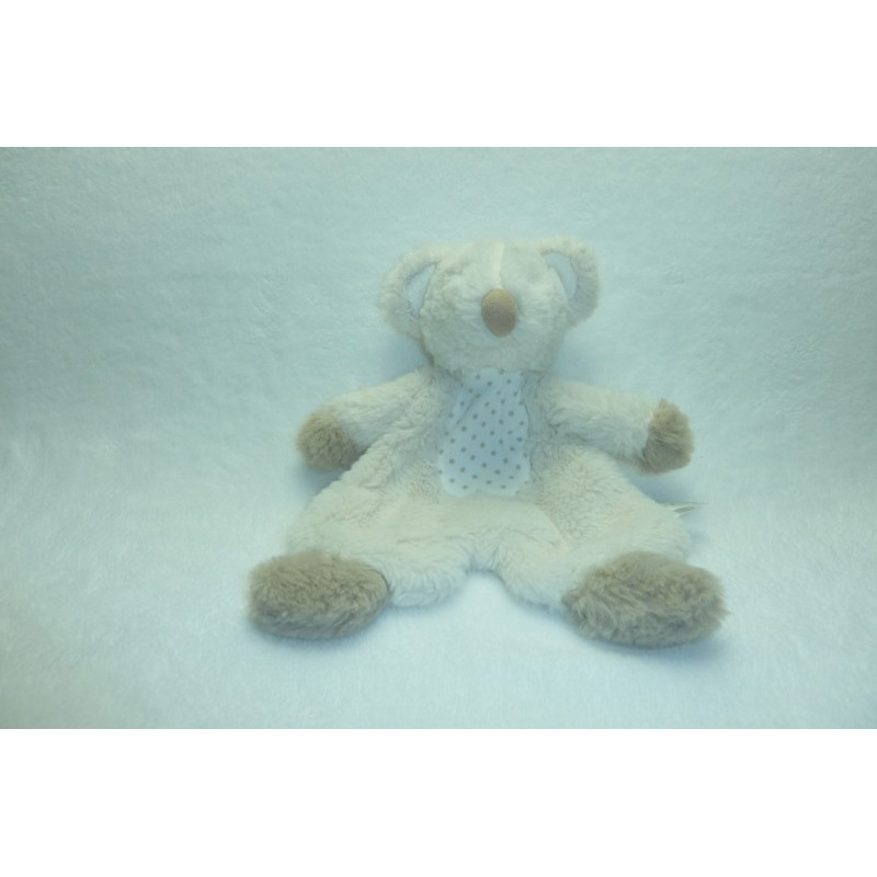 Description du doudou : Doudou plat ours 24 cm environ. Coloris : blanc, taupe, imprimé étoiles. Etat : Comme neuf. DOUDOU DIFFICILE A TROUVER