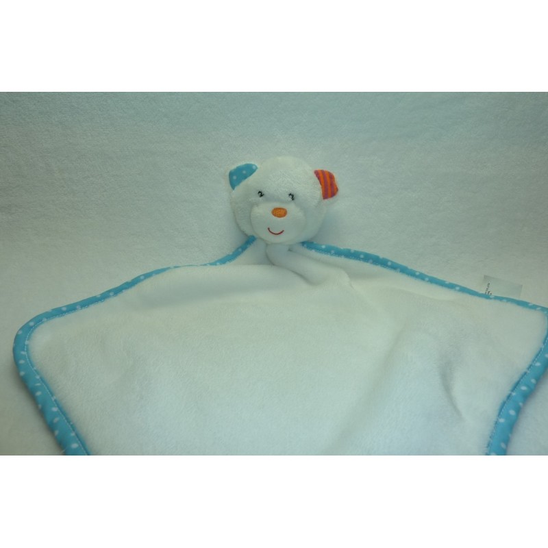 Description du doudou : Doudou plat ours, forme losange de 40 cm environ de longueur, grelot. Coloris : blanc, contour bleu à pois blancs. Etat : Neuf sans étiquette boutique. Produit original. DOUDOU DIFFICILE A TROUVER